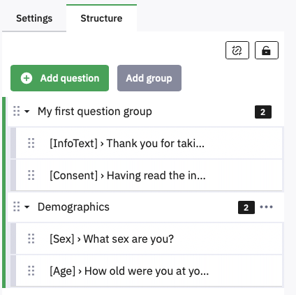 You can also re-order Groups by dragging their title up or down, and can move questions between groups.