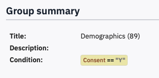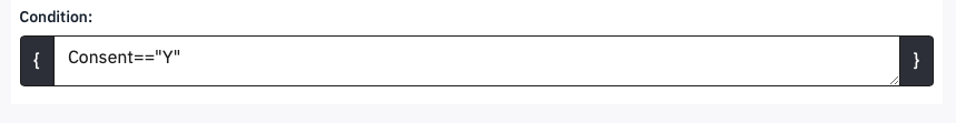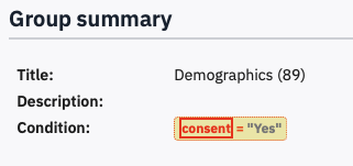 We need to set a condition for the Demographics group, and any other questions, so that it is only shown when Consent has been given and the answer recorded is Y.