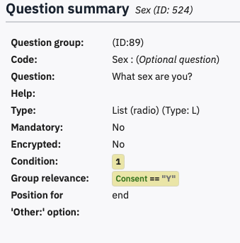 You can also set the Condition at a Question level. If you click on Sex, to see the Question Summary, you can see that it has inherited the Group relevance setting from the group’s Condition. Consent is now green to show that it is a valid question name. The Sex question’s condition is set to 1, which means ‘TRUE’ or ‘Always’ show, provided that the Group is being shown.
