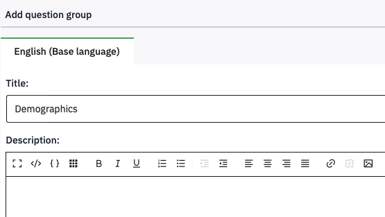 To show these on a new page, click Add Group, and give the Group the Title Demographics. Here is no need to add a Description.