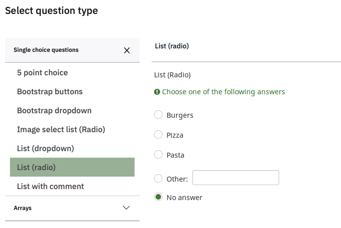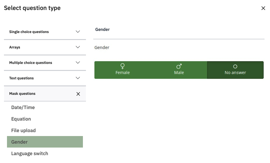When you select the Question Type, you will see that in Mask there is a predefined Gender question, which you can use later if you like, but for now please use Single Choice Questions and choose List (radio) (radio means that it used ‘radio buttons’ which only allow one option to be chosen, unlike checkboxes, which allow several options to be chosen).