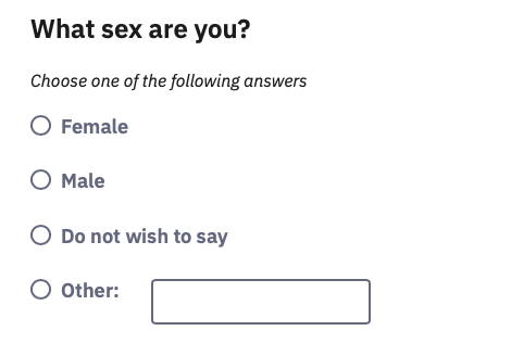 Consider how you would report this in your write-up: you would probably not want to use a lot of space on this, and would just write ‘67 female, 48 male, and two others’. You could therefore add a ‘Do not wish to say’ option.
