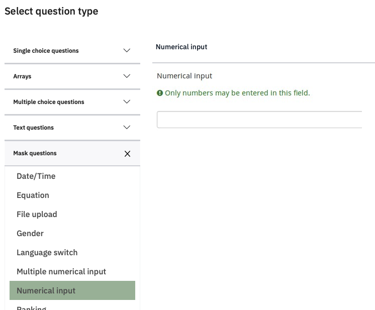 To force people to enter a number, create a new question and select Mask questions, Numerical input