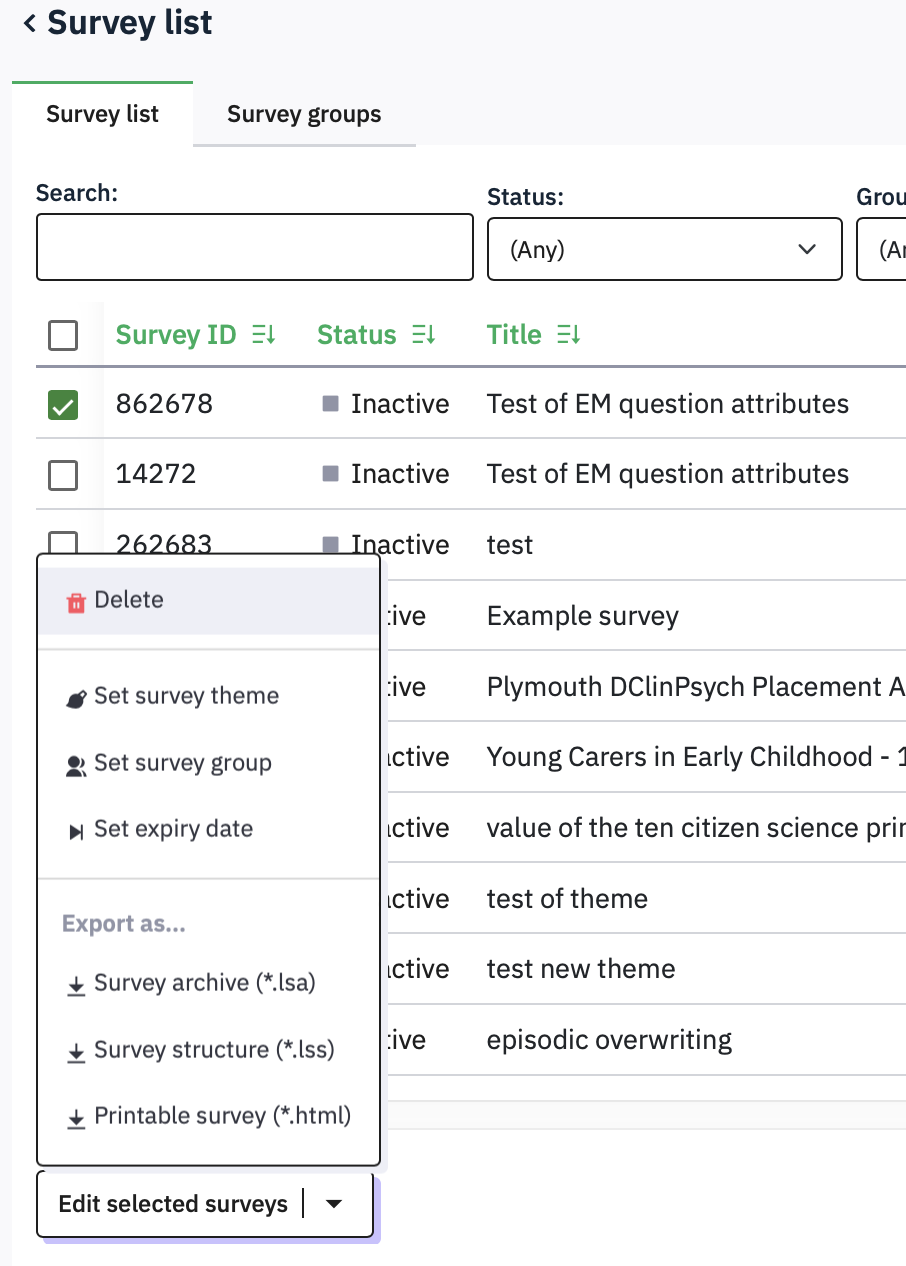 Alternatively, you can export surveys from the Survey list page by checking the box next to the survey and clicking Edit selected surveys.