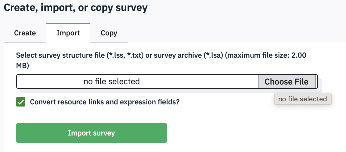 If you ever want to run the survey again, or make a modified version of it, then you would use the purple Create Survey button and import an .lsa or .lss file from your computer:
