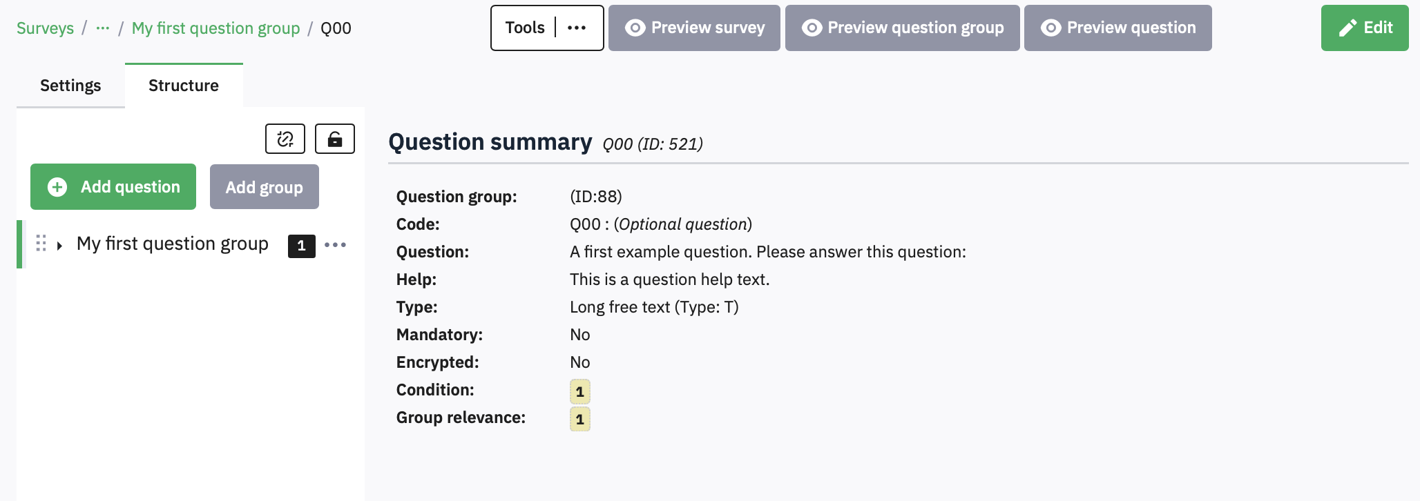 Below that are two tabs – the overall Settings for your survey and the Structure which lists the actual questions. At the moment, you cannot see your Q00 in this list, but if you click the little triangle in the group name, it will be shown. Hiding questions until you need to see them helps keep the view manageable.
