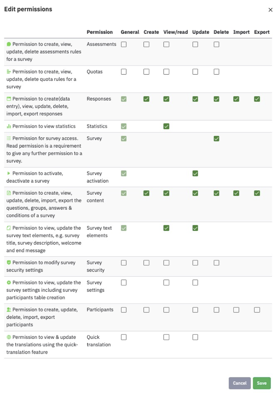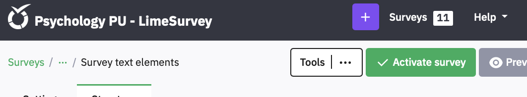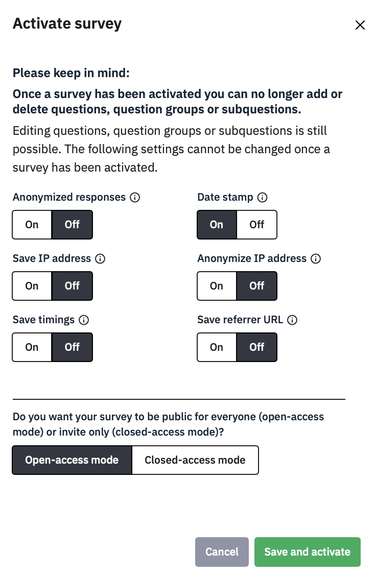 Despite the scary warnings in the next pop up, you can add and delete things, if you deactivate the survey again, though this will delete any data you’ve collected in the meantime so you should not actually collect real data until you have thoroughly pilot tested the survey and checked its data file. Check that Date stamp is On, so you can work out when each participant did the survey. Leave the rest Off. You do want Open-access mode unless you are using a Limesurvey Panel to invite people from a mailing list you have set up (not in this guide).