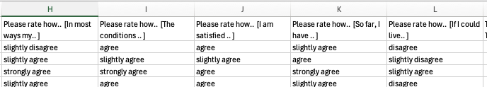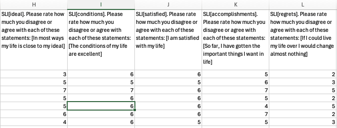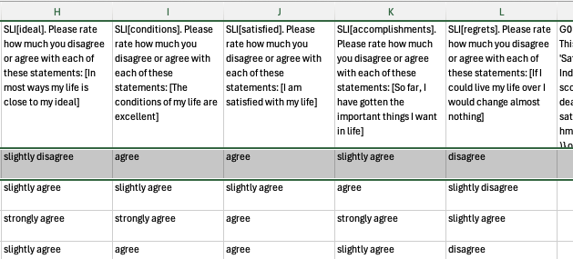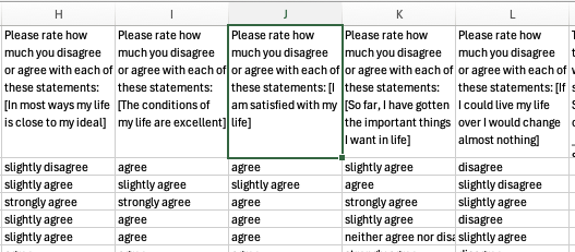 This data file is fully comprehensible in its own right, without needing a copy of the survey to consult to understand what was asked or what the answers mean. For analytic purposes, the header row cells start with the Question name, the subquestion code in brackets, followed by the Question text, and then the subquestion text in brackets.