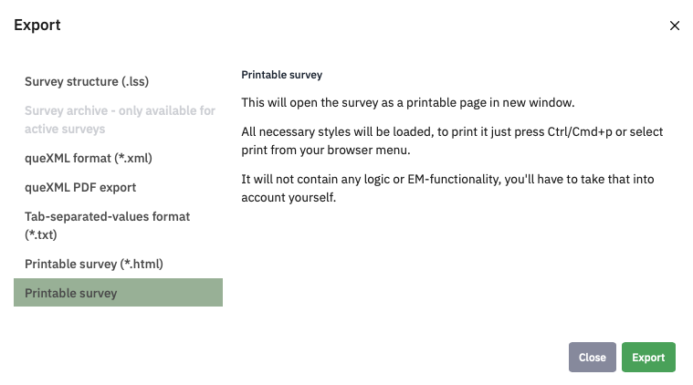 Then select Printable from the options available. This will let you print or save a copy of your survey (print to PDF).