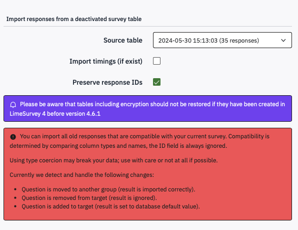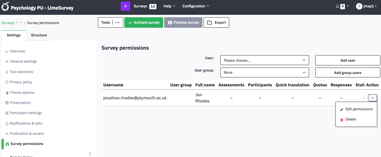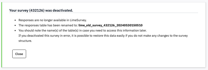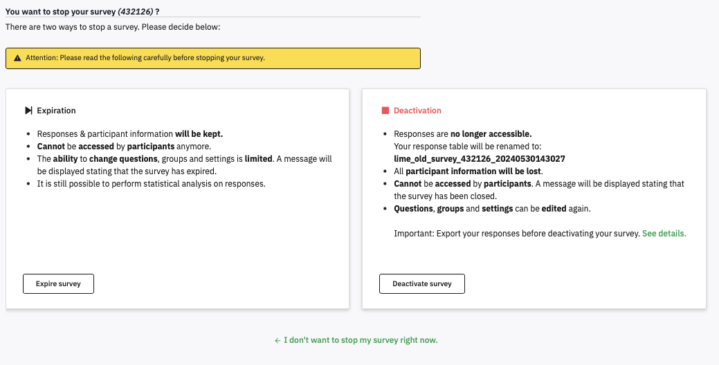 If you have just finished piloting and not yet run the survey, then you want to take the right-hand option, to Deactivate survey – but this will make the data harder to find (it is not deleted). Choose this one if you have been piloting to collect test data, and you have already exported the fully labelled Question code & question text version with Full answers.