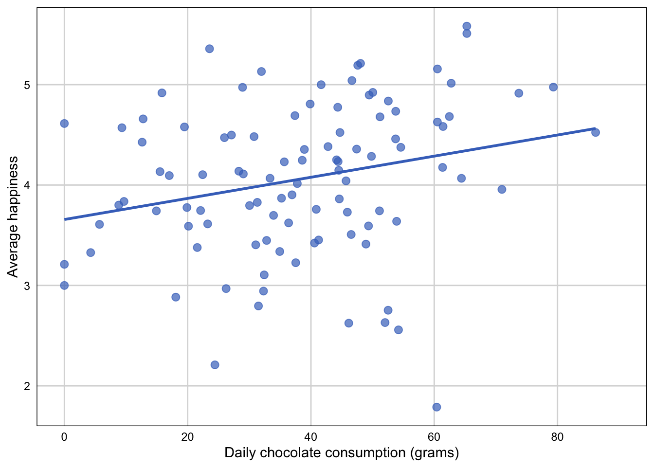 A Pearson correlation coefficient was computed to assess the relationship between chocolate consumption and self-reported happiness. The results revealed a significant positive correlation, r(98) = .31, p = .002, indicating that higher average chocolate consumption was associated with higher reported happiness across the week.
