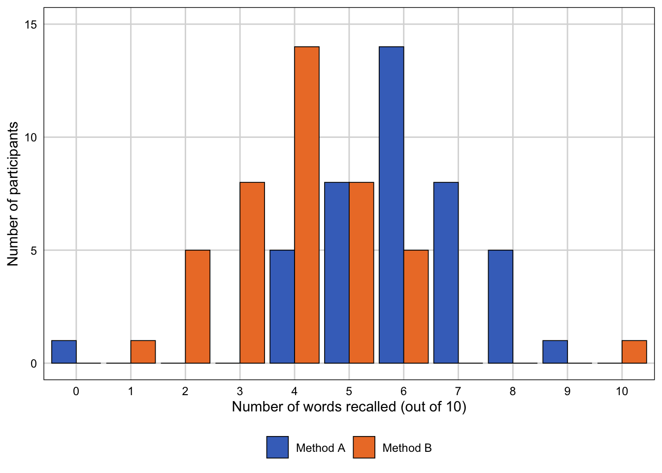 Overall, you find that on average people studying using Method A recalled more (Mean = 5.9/10) than those in Method B (Mean = 4.0/10).