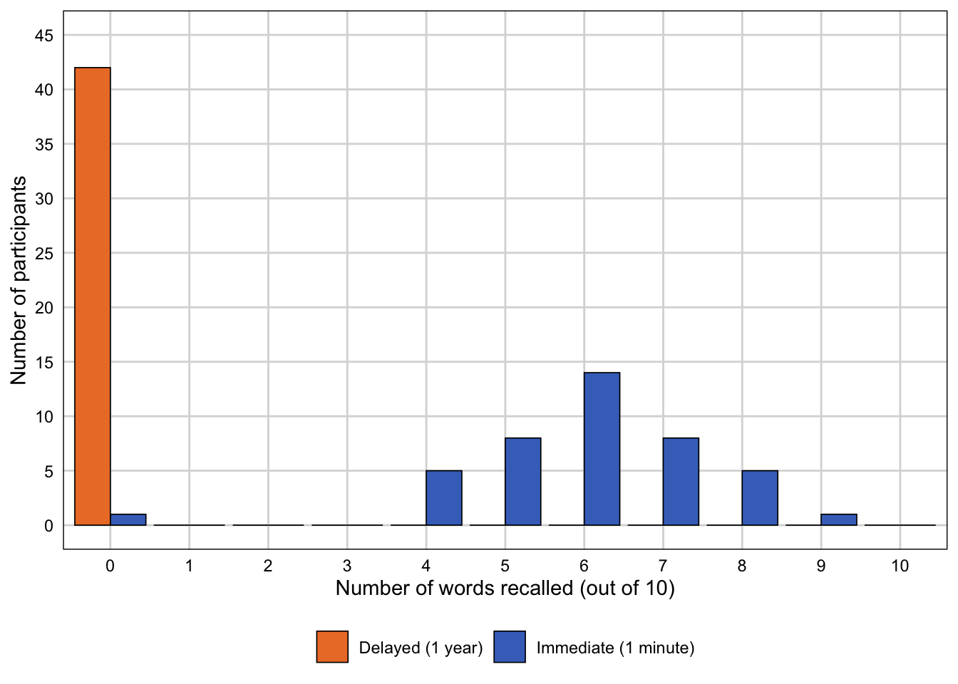 Overall, you find that people tested immediately have better memory (Mean = 5.9/10) than those tested after 1 year (Mean = 0/10).
